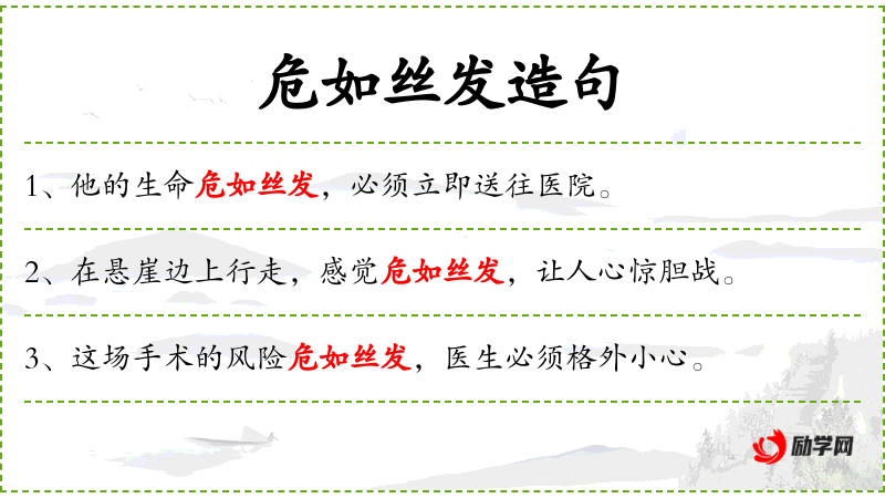 - 危如丝发:形容危险的程度极高,就像头发丝一样细小而脆弱。