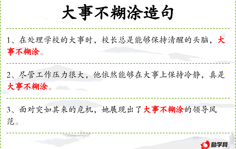 - 大事不糊涂:成语,形容在重要事情上头脑清醒,不犯糊涂。