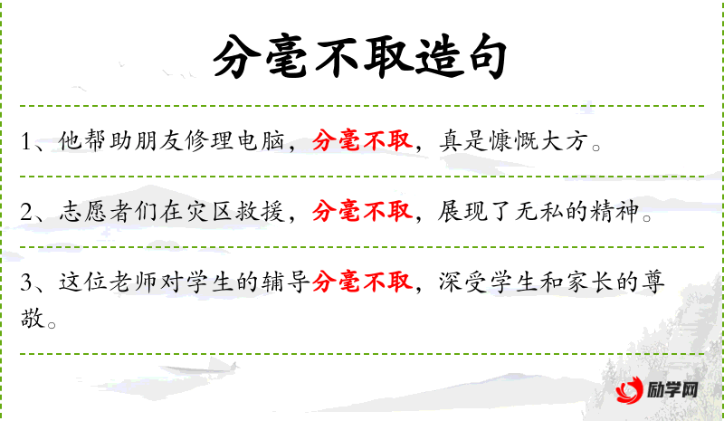 在实际交流中,这样的句子通常用于赞扬或评价某人的行为。它传达了一种正面的评价和尊重,体现了礼貌用语和积极的语气。句子中的“分毫不取”强调了行为的纯粹性和无私性。