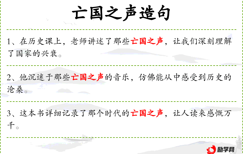 句子可能在讨论文学作品、历史或艺术表达时出现,强调了语言的力量和对历史的深刻反思。在不同的文化和历史背景下,“亡国之声”可能指向不同的具体,但都传达了对国家和民族命运的深刻关注。
