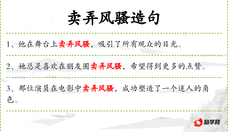 - 派对上:介词短语,表示地点。 *. 卖弄风骚:动词短语,表示故意展示自己的魅力以吸引注意。