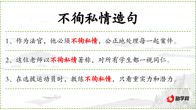 - 不徇私情:不因个人情感或关系而偏袒某一方。