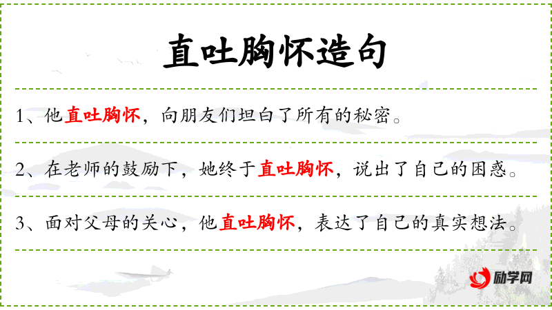 1. 【直吐胸怀】 - 直:直爽;抒:抒发。坦率地发表自己的意见。