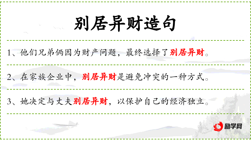 - 不同句式:别居异财,在某些文化中,被当作维护家庭和谐的手段。
