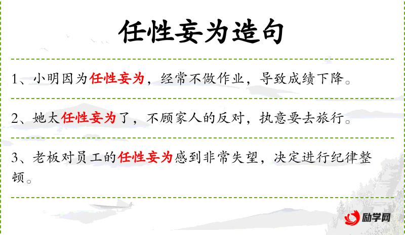 - 任性妄为:形容一个人行为不受约束,任意妄为。