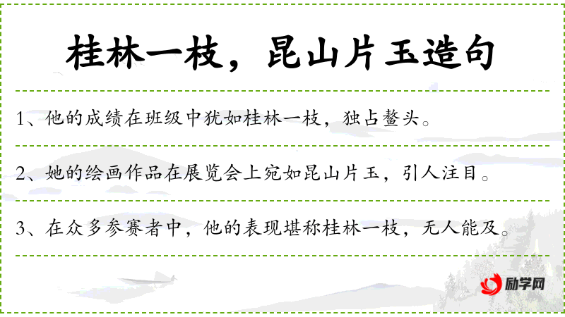 1. 【桂林一枝】 - 桂花林中的一枝花。原为晋时郤诜的自谦语。后称誉人才学出众。