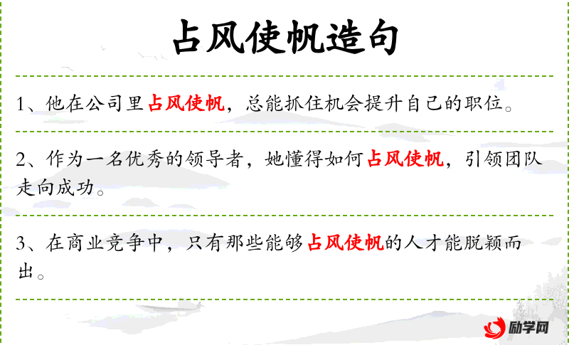 - 占风使帆:比喻善于利用形势,掌握时机。