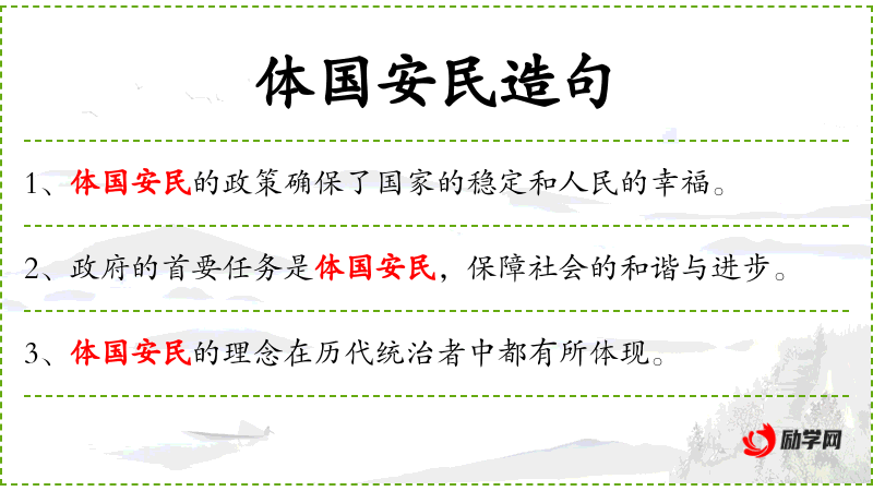 - 体国安民:指国家安定和人民安居乐业的状态。