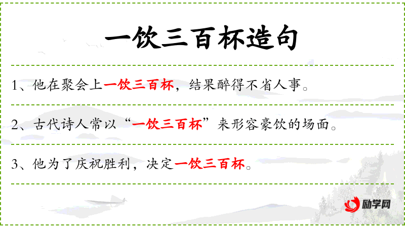 1. 【一饮三百杯】 《世说新语.文学》"郑玄在马融门下"刘孝标注引《郑玄别传》"袁绍辟玄,及去,饯之城东。欲玄必醉,会者三百余人,皆离席奉觞,自旦及莫,度玄饮三百余杯,而温克之容,终日无怠。"后谓痛饮为一饮三百杯。