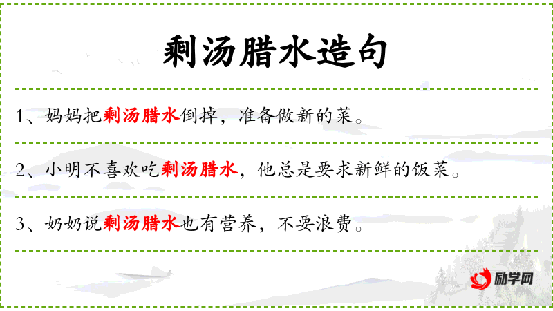 1. 【剩汤腊水】 吃剩下来的饭菜。