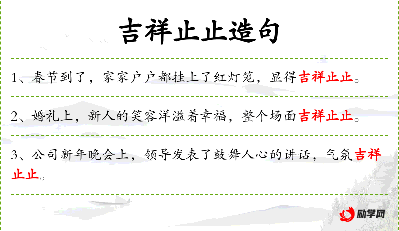 这个句子在实际交流中用于描述一个喜庆的场合,传达出祝福和喜悦的情感。使用“吉祥止止”这样的表达,增加了语言的文雅和祝福的深度。