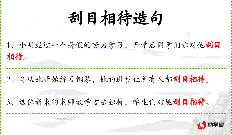 - 刮目相待:成语,表示重新审视,给予更高的评价。
