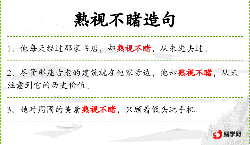 1. 【熟视不睹】 - 熟视:细看;睹:看见。看惯了就像没看见一样。也指看到某种现象,但不关心,只当没有看见。