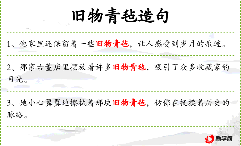 1. 【旧物青毡】 青毡子是家传的故物。比喻珍贵之物。