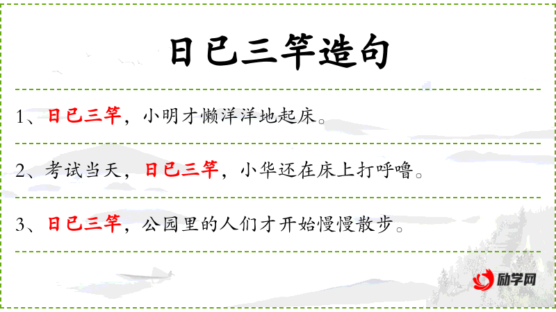 - 日已三竿:这个成语源自**古代,竿指的是古代测量太阳高度的工具。这个成语反映了古代的时间观念和生活方式。