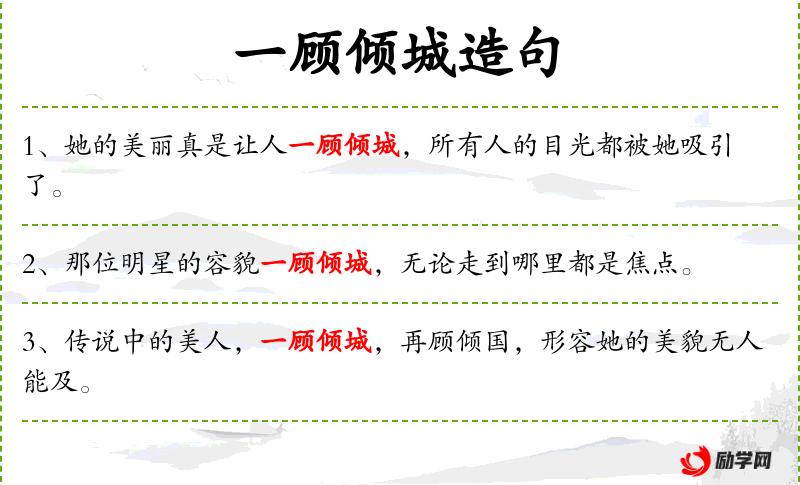 1. 【一顾倾城】 - 形容美女的眼波,也比喻女子的美貌。