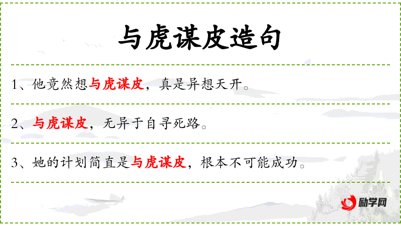 1. 【与虎谋皮】 - 谋:商量。跟老虎商量要剥它的皮。比喻跟恶人商量要他放弃自己的利益,绝对办不到。