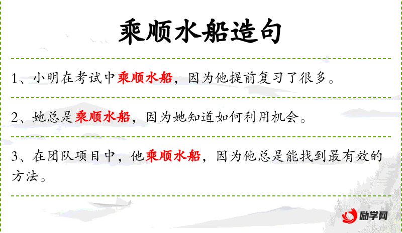 句子中的“乘顺水船”是一个比喻,源自**文化中的船只顺流而下的形象,比喻事情进展顺利。这反映了汉语中常用的比喻表达方式。