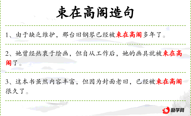 1. 【束在高阁】 - 捆起来以后放在高高的架子上。比喻放着不用。同“束之高阁”。