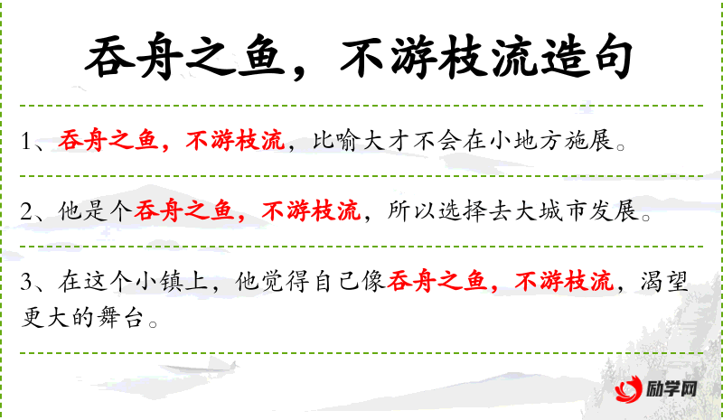 - 宾语:自己像吞舟之鱼,不游枝流,渴望更大的挑战