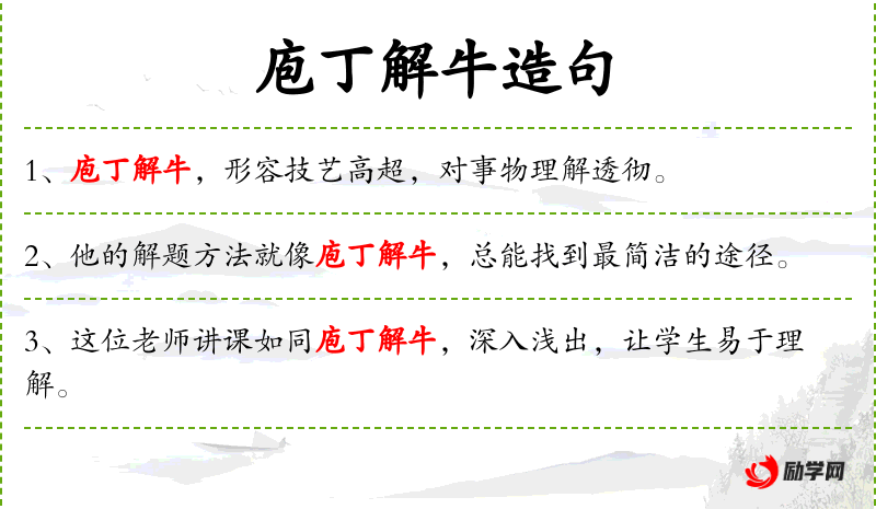 - 庖丁解牛:这是一个汉语成语,源自《庄子·养生主》,比喻对事物有深刻的理解和处理能力。