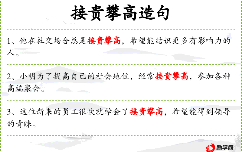 - 接贵攀高:比喻与地位高的人交往,以求提升自己的地位。