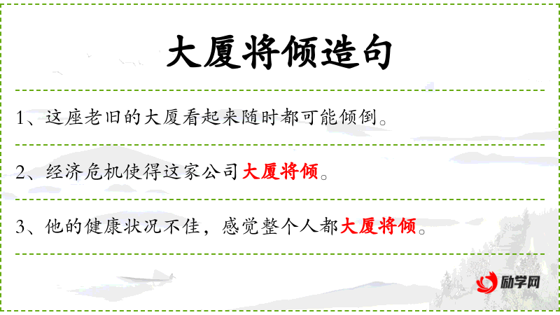 - 大厦:比喻稳固的结构或体系。 *. 将倾:指即将倒塌或崩溃。