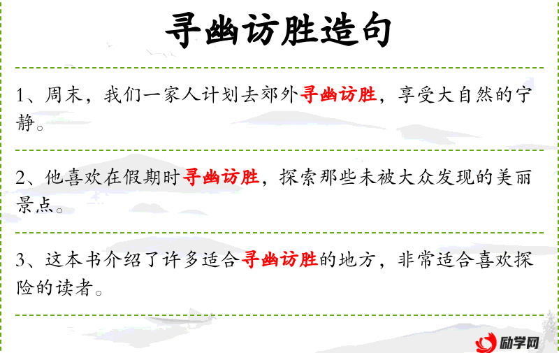 - 寻幽访胜:指探访幽静美丽的地方,寻求心灵的宁静和知识的丰富。