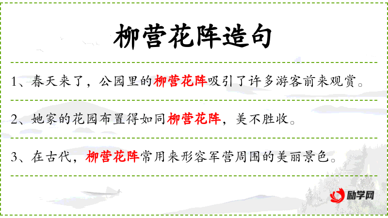4. 【柳营花阵】 - 旧指妓院或妓院聚集之处。