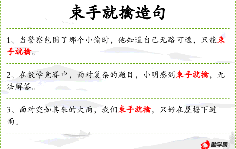 2. 【束手就擒】 - 束手:自缚其手,比喻不想方设法;就:受;擒:活捉。捆起手来让人捉住。指毫不抵抗,乖乖地让人捉住。