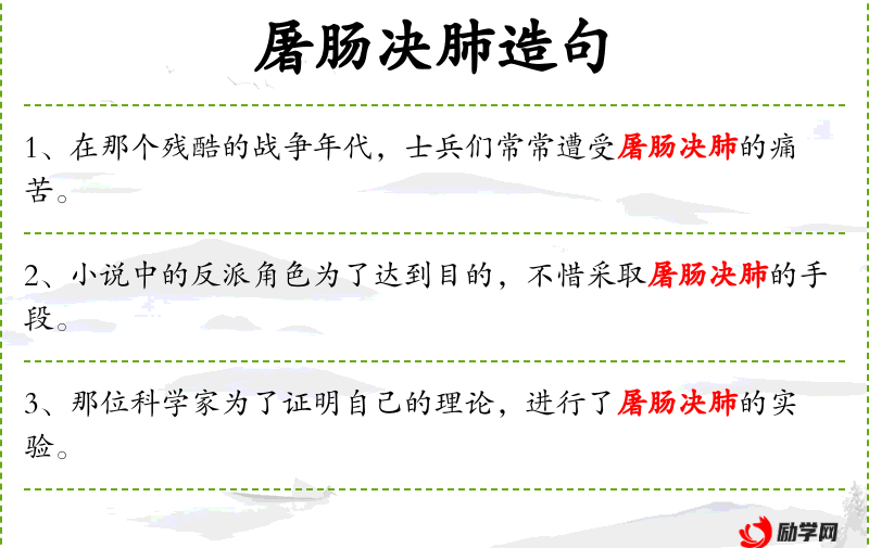 “屠肠决肺”这一表达源自古代文学,反映了古代对英雄形象的夸张描述。了解这一成语的来源和历史背景有助于更深入地理解句子的文化内涵。