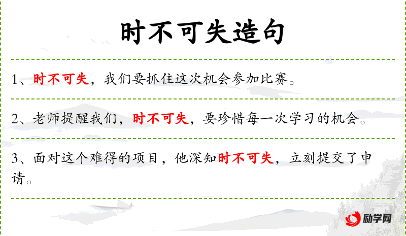 句子:“[老师提醒我们,时不可失,要珍惜每一次学*的机会。]”