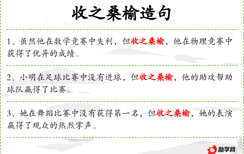 - 收之桑榆:成语,比喻在不利情况下仍有所收获,源自《后汉书·冯异传》。 *. 坚持和努力:表示持续的努力和不懈的追求。