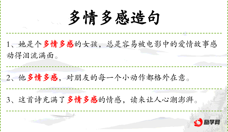 - 多情多感:形容一个人情感丰富,容易感动。