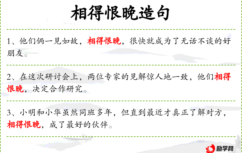 11. 【相得恨晚】 认识太晚了。形容新交的朋友十分投合。