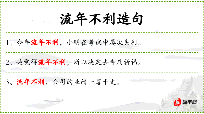 4. 【流年不利】 流年:旧时算命看相的人称一年中所行之“运”;利:吉利。指人长年里处于不吉利的状态。谓时运不佳。