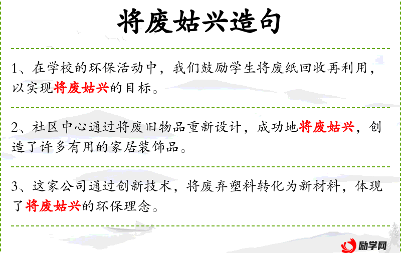 - 相关成语:“废物利用”、“变废为宝”等,强调资源的再利用和环保。