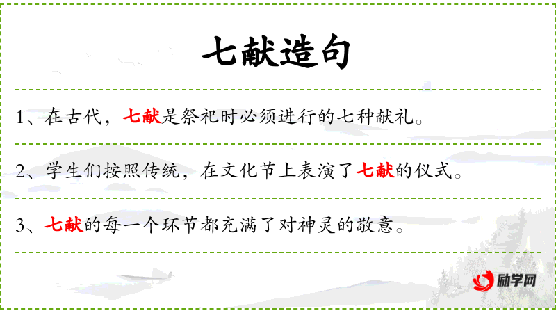 1. 【七献】 献酒七次。周代诸侯来朝时,天子举行享礼献酒的次数。《周礼.秋官.大行人》"诸侯之礼……飨礼七献,食礼七举。"祭祀宗庙亦用七献。《礼记.礼器》"一献质,三献文,五献察,七献神。"孔颖达疏"七献神者,谓祭先公之庙,礼又转尊,神灵尊重也。"