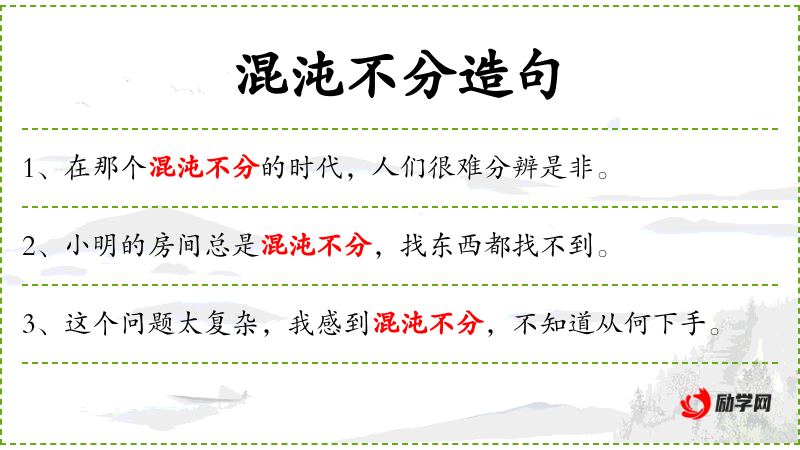 5. 【混沌不分】 混沌:亦作“浑沌”,古代寓言中的中央帝名。原意是借喻一切事物都应顺其自然。后常用以表示愚昧无知。