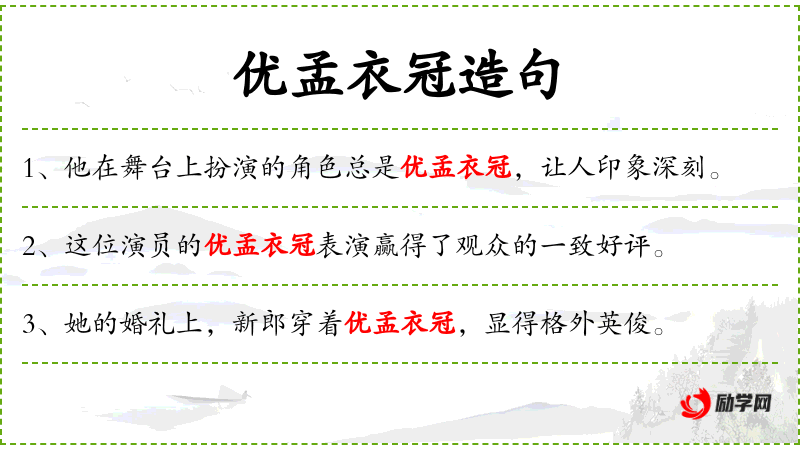 - 优孟衣冠:这个成语源自《左传·僖公二十五年》,形容文人的装束风雅。