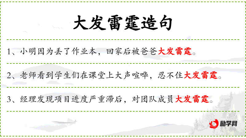 1. 【大发雷霆】 霆:极响的雷,比喻震怒。比喻大发脾气,大声斥责。