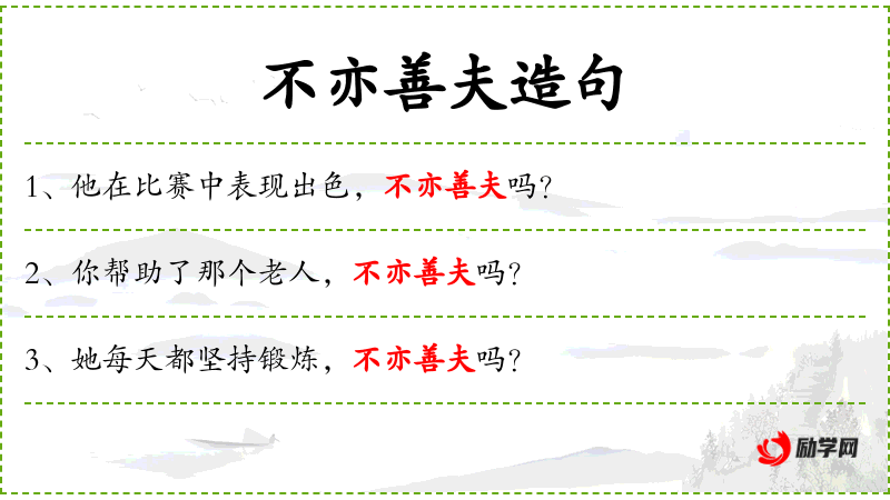 - 使用“不亦善夫吗?”这种文言文式的表达,增加了句子的文雅和礼貌程度。
