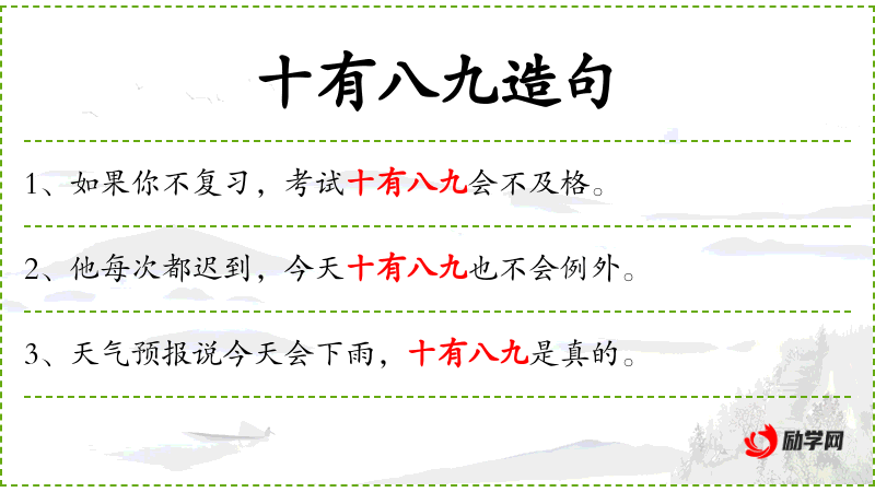 - “十有**”是一个常用的成语,表示可能性很大,反映了汉语中对概率的表达方式。