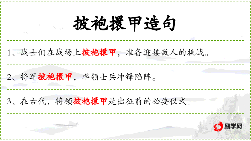 1. 【披袍擐甲】 披:穿;擐:套。穿上战袍,套上铠甲。指做好战斗准备。