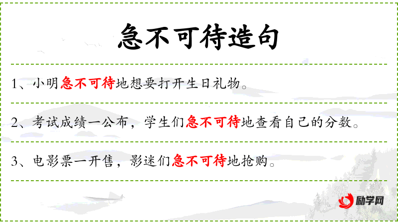 1. 【急不可待】 急得不能等待。形容心怀急切或形势紧迫。