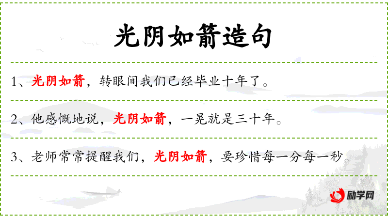 - 成语:“光阴如箭”是一个常用的成语,强调时间的宝贵和不可逆转。