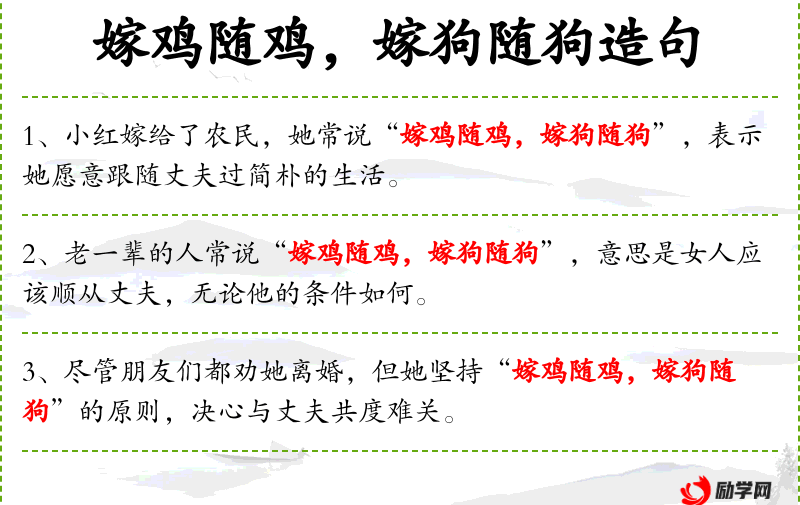 - 成语:“嫁鸡随鸡,嫁狗随狗”是**传统成语,反映了传统婚姻观念中女性应顺从丈夫的思想。
