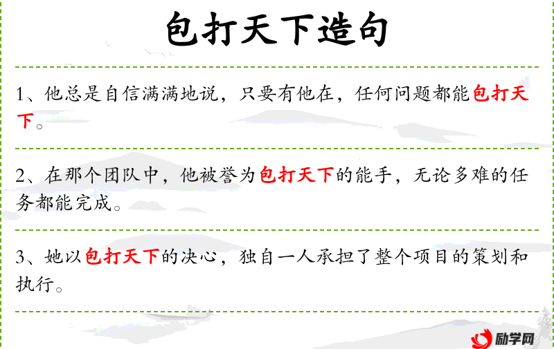 - 包打天下:这个成语源自**古代,意指有征服世界的雄心壮志,常用于形容有远大抱负的人。