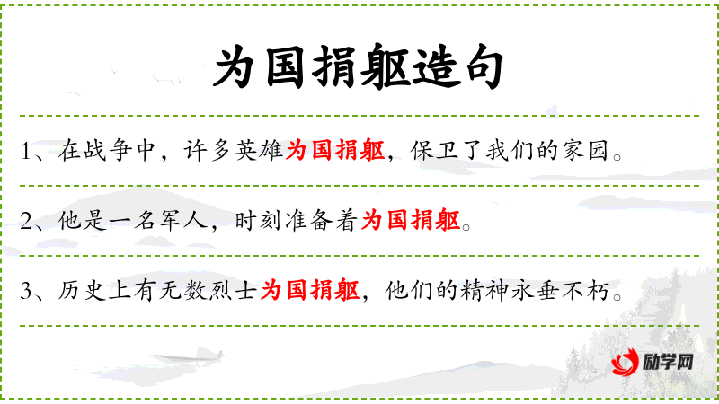 - 为国捐躯:为国家牺牲生命。形容英雄为国家利益而献出生命。