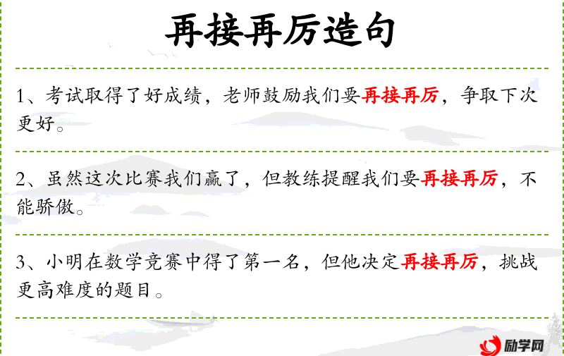 - 成语:再接再厉,源自《左传·宣公十五年》,意为继续努力,不停止。